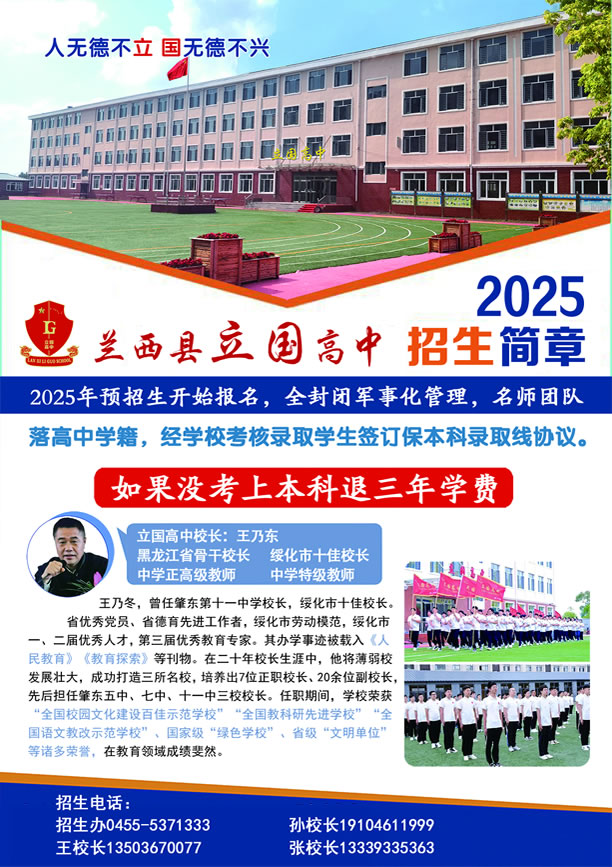 蘭西縣立國藝術中學,一校區(qū)位于蘭西縣福和城6號樓附近(二校區(qū)待建中),校園占地面積7000平方米。其中綠化面積400平方米,運動場地面積3785平方米。建筑面積3652平方米,其中教學樓3400平方米,警務室、倉庫(板房)等260平方米。功能室、教育教學設施齊全,共有領導辦公室6個。功能室16個(包括音、體、美器材室;音、體、美教室;理、化、生實驗室3個及理、化、生實驗準備室儀器室3個、健康體檢室、閱覽室(2個)、圖書室、檔案室、微機室和多功能報告廳)。教學樓還內設財務室、主控室、儲藏室、衛(wèi)生間。
