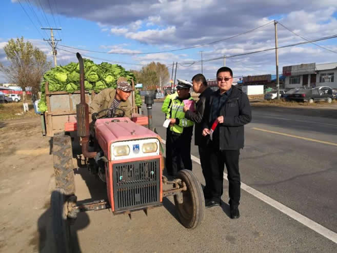 當(dāng)前正值秋收冬儲農(nóng)忙季節(jié),各類農(nóng)用車、拖拉機、農(nóng)用機械上路行駛增多,農(nóng)村地區(qū)道路交通安全隱患集中顯現(xiàn)。為進一步加強農(nóng)村道路交通安全管理工作,有效預(yù)防和減少道路交通事故的發(fā)生,肇東交警大隊聯(lián)合市交通執(zhí)法大隊、農(nóng)業(yè)綜合執(zhí)法大隊開展聯(lián)勤聯(lián)" />