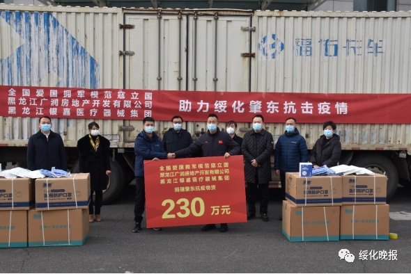 11月24日,正值肇東市抗擊新冠疫情關(guān)鍵時(shí)刻,肇東籍企業(yè)家、立國集團(tuán)董事局主席寇立國,攜手黑龍江銀嘉醫(yī)療器械集團(tuán)董事長朱宏偉、黑龍江廣潤房地產(chǎn)開發(fā)有限公司董事長馬麗,向肇東市捐贈(zèng)總價(jià)值230萬元的防疫物資。