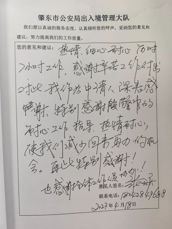 4月18日,從香港返鄉(xiāng)的肇東籍居民張先生攜妻子陳女士來到肇東市公安局出入境接待大廳,妻子陳女士是香港人,兩人此次是專程飛回來辦理張先生赴香港定居手續(xù),為了不耽誤二人的返程時間,辦證民警加班加點忙碌兩個多小時為張先生辦理通過所需辦證材料,張先生感動不已,連連說:“家鄉(xiāng)人太好了,你們出入境民警太暖心了!”當即寫下一封感謝信表達心情。