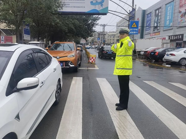 雨中,民警在轄區(qū)學校護學崗增派警力,指揮過往車輛,對接送學生的車輛進行快速疏導,護送學生安全過馬路,保障學生上下學交通安全及周邊道路交通安全有序暢通。全體執(zhí)勤民輔警縱然全身濕透,也沒有一絲怠慢,在各自的崗位上不畏風雨,恪盡職守,全力保障雨天轄區(qū)道路安全暢通和廣大群眾的出行安全。