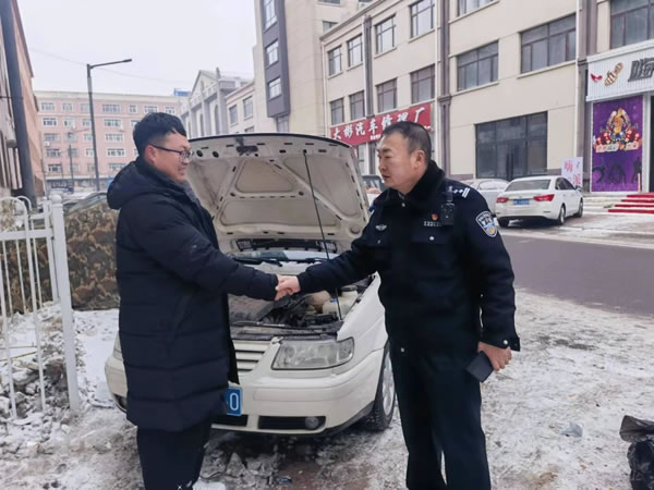 近日,肇東市公安局警格員(交警大隊(duì)民警張曉偉)及時幫助群眾對電打火啟動車輛,獲得社區(qū)群眾高度贊揚(yáng)。