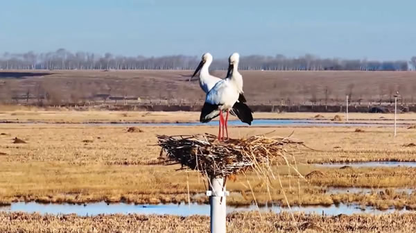 東方白鸛是國(guó)家一級(jí)保護(hù)動(dòng)物,該物種已被列入《國(guó)家保護(hù)的有益的或者有重要經(jīng)濟(jì)、科學(xué)研究?jī)r(jià)值的陸生野生動(dòng)物名錄》。由于東方白鸛性情機(jī)警而膽怯,且現(xiàn)在為筑巢期,更是害怕驚擾,所以記者只能在濕地工作人員的引導(dǎo)下通過(guò)無(wú)人機(jī)遠(yuǎn)遠(yuǎn)的拍下他們優(yōu)雅美麗的身影,今年濕地東方白鸛數(shù)量的大幅增加無(wú)疑是對(duì)該區(qū)域生態(tài)環(huán)境的極大信任和認(rèn)可。