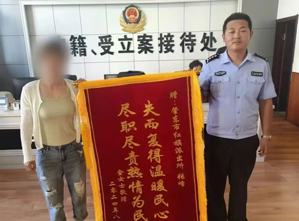 9月2日上午,哈爾濱市民金女士來到肇東市公安局紅旗派出所,將一面繡有“失而復(fù)得溫暖民心 盡職盡責(zé)熱情為民”的錦旗交到民警手中,感謝民警幫助她找回遺失的手機(jī)。