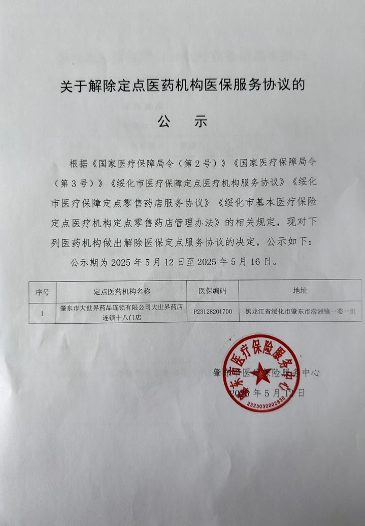 關(guān)于解除定點醫(yī)藥機構(gòu)醫(yī)保服務(wù)協(xié)議的公示