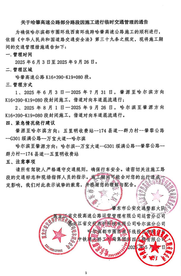 關(guān)于哈肇高速公路部分路段因施工進(jìn)行臨時(shí)交通管理的通告