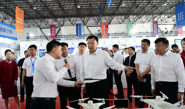 張寶偉、李元學(xué)等在肇東北大荒通用機(jī)場(chǎng)參觀無(wú)人機(jī)及航材。