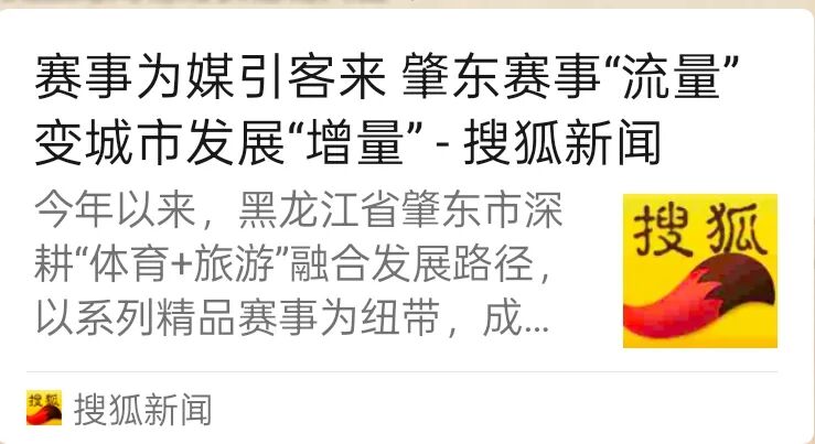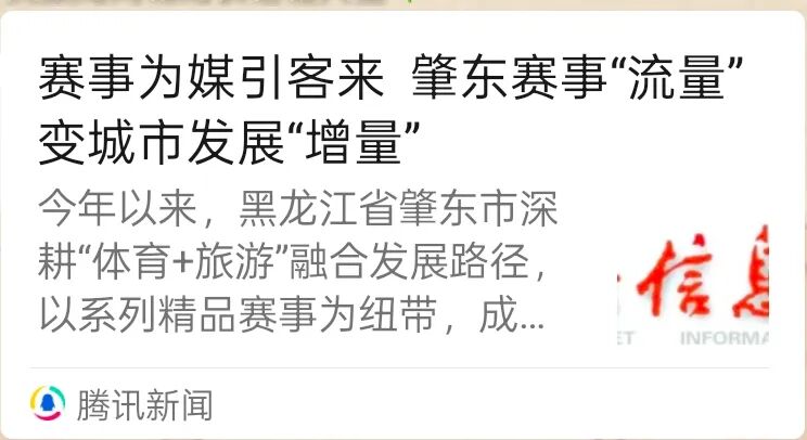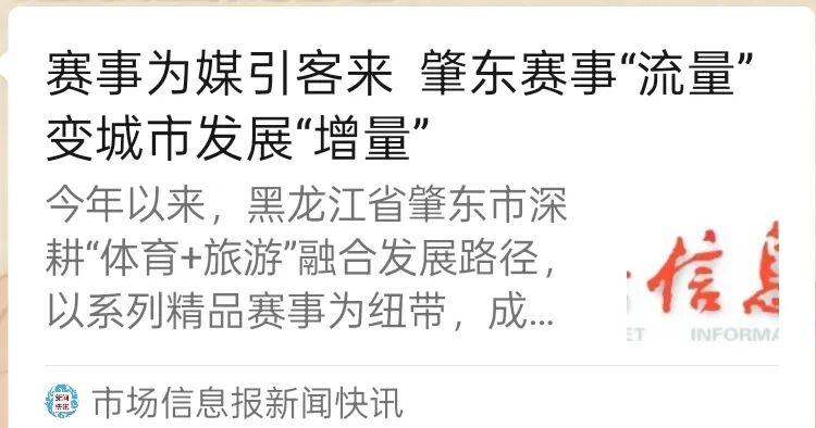近日,肇東市以系列精品賽事為核心的文體旅融合發(fā)展模式引發(fā)多家媒體集中關注,今日頭條、騰訊新聞、搜狐新聞、百度、市場信息報信息快訊等多家媒體相繼聚焦其賽事經濟成效進行專題報道,讓肇東“以賽促游、以游興城”的發(fā)展故事成為矚目焦點,賽事經" />