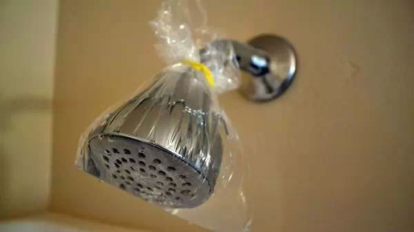 20.蓮蓬頭有的眼堵了怎么辦,據(jù)說用塑料袋里倒點(diǎn)醋像這樣扎在噴頭上泡一夜就能通了。