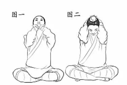 十指交叉抱于腦后,上體左轉(zhuǎn)45度,然后右傾,抻拉左脅肋部,略停兩秒后恢復(fù)上體正直,再左傾抻拉右脅肋部;然后,頭向上充分抬起,兩手在頸下稍稍向上助力,與頸部形成爭力,略停兩秒(如圖1);慢慢低頭,兩掌抱頭下按,略停兩秒(如圖2)。