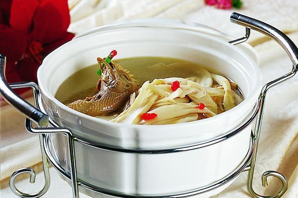 鍋置火上,倒入適量凈水燒沸。加料酒和鹽,放入雞塊,小火微燉10分鐘,隨后放入山藥和筍片,燉5分鐘后放入菠菜段,加胡椒粉,淋幾滴小磨香油即成。