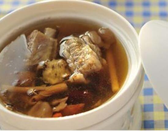 排骨1根,枸杞,紅棗12枚,當(dāng)歸4片。排骨洗凈,飛水去異味后放入沙鍋,加枸杞、紅棗、當(dāng)歸、蔥、姜片,大火燒開再小火燉至排骨熟爛,起鍋前加入鹽、雞精調(diào)味即可。此款湯品可以滋陰潤燥、養(yǎng)顏?zhàn)o(hù)膚。