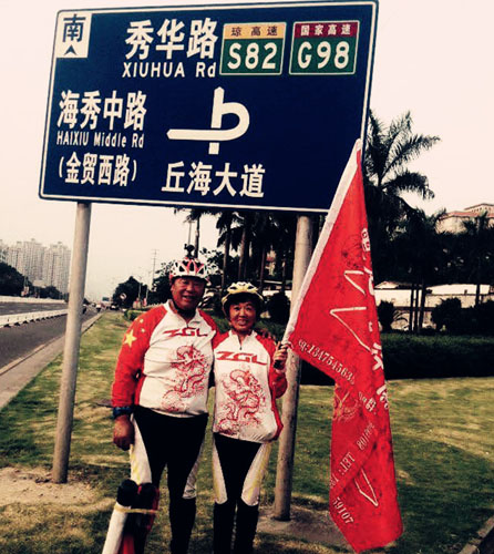 長途騎行,夫妻倆早就做好了應(yīng)對各種困難的思想和物質(zhì)準(zhǔn)備,隨車攜帶的物品足有20多公斤。路經(jīng)黑、吉、遼、冀、京、豫、鄂、湘、桂、瓊等九省一市,39天騎行4700多公里。途中爬山涉水,翻山越嶺,寒暑相隨,風(fēng)雨相伴,刺激與開心共存。騎行第三天,在吉林省南部遇到了罕見的11級大風(fēng)惡劣天氣,騎車寸步難行,只能艱難地推行30多公里到達(dá)康平縣。兩人對視這全身滿臉、甚至嘴里滿是灰塵的狼狽相,仍然談笑風(fēng)生。