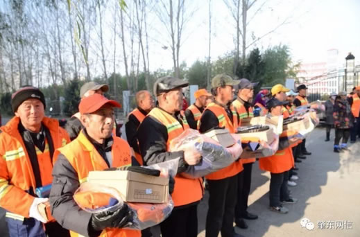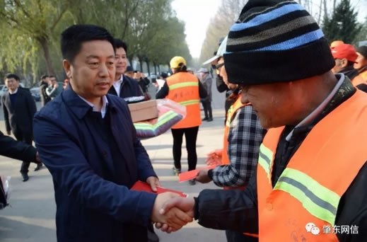 在西園區(qū)辦事處佳和社區(qū)環(huán)衛(wèi)工作現(xiàn)場,李延春與環(huán)衛(wèi)工人代表一一握手,并向環(huán)衛(wèi)工人發(fā)放了冬季棉衣、棉帽、手套、棉鞋等冬季保暖用品及慰問金。