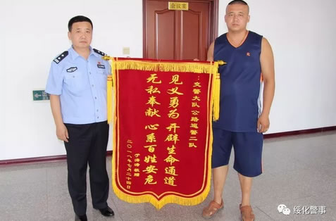 8月7日,肇東市民于海濤在家屬的陪同下來(lái)到交警大隊(duì),獻(xiàn)上了一面寫有“見(jiàn)義勇為開(kāi)辟生命通道、無(wú)私奉獻(xiàn)心系百姓安危”的錦旗,向大隊(duì)領(lǐng)導(dǎo)講述了交警大隊(duì)公路巡警二中隊(duì)積極救助自己的事跡。7月24日上午,大隊(duì)公路巡警二中隊(duì)在鐵東肇蘭新河附近開(kāi)展路面巡查,9時(shí)35分左右,當(dāng)民警在肇蘭新河橋西對(duì)一輛由東向西行駛的小型轎車?yán)袡z查時(shí),車輛駕駛?cè)擞诤话l(fā)腦梗,情況危急,中隊(duì)民警立即啟動(dòng)應(yīng)急預(yù)案,由中隊(duì)長(zhǎng)李佳彪指揮,民警遇正義、王立德駕駛警車,開(kāi)啟綠色通道,迅速將于海濤送至肇東市人民醫(yī)院進(jìn)行搶救,為于海濤得到及時(shí)治療贏得了寶貴時(shí)間。經(jīng)人民醫(yī)院醫(yī)務(wù)人員全力救治,于海濤脫離生命危險(xiǎn),住院進(jìn)行后續(xù)治療。于海濤出院以后,馬上到交警大隊(duì)當(dāng)面致謝,感謝人民警察對(duì)自己積極的救助,稱贊肇東交警是人民的守護(hù)神。